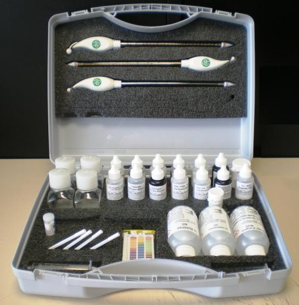 Complete test kit with 3 glass burettes 25ml, reagents for total hardness, Alkalinity (M & P) and Chloride  and all necessary accessories (test jars, syringes …)