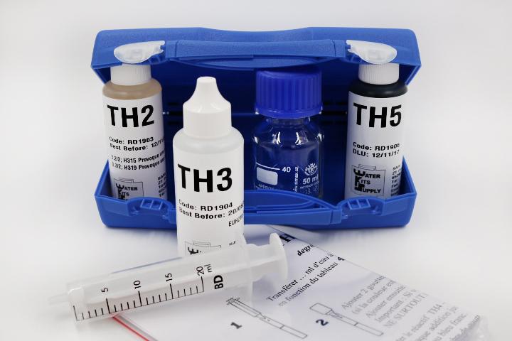KIT TH (Dureté Totale) 0 - 6 degrés français - Gamme Basse, complet en mallette avec grands flacons compte-goutte 65ml (1500 gouttes) TH5 et TH3, un v...
