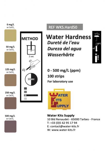 100 Bandelettes TH dureté 0-500 ppm. 0-50 degré français 0 - 50 - 125 - 250 - 500 mg/L CaCO3 ou PPM = 0 - 5 -12,5 -25 - 50 degré Français ...